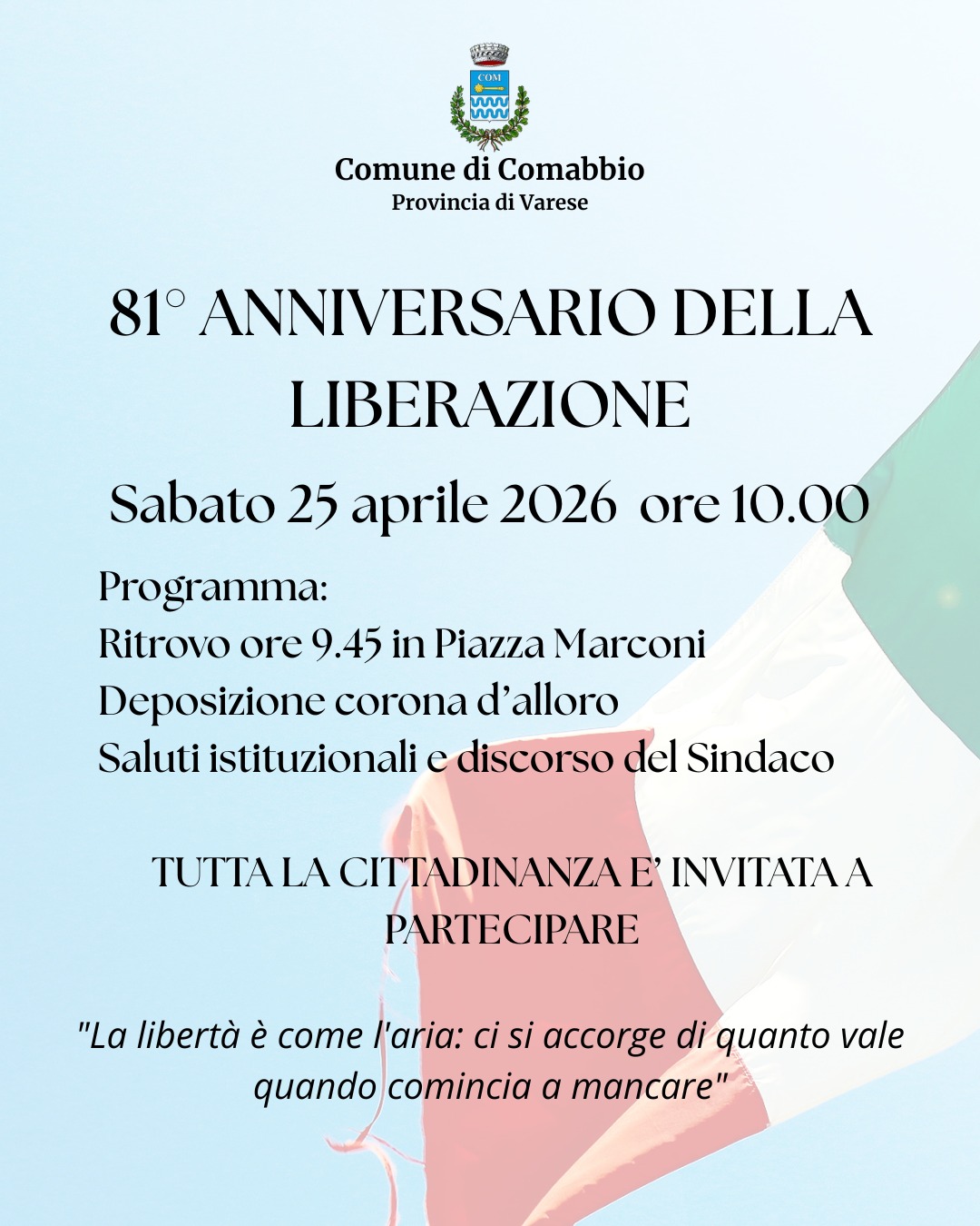 Sabato 25 aprile alle ore 10.00 si terrà presso il monumento ai caduti in piazza Marconi 1 la cerimania per la celebrazione del 25 aprile. Tutta la cittadinanza è invitata a partecipare