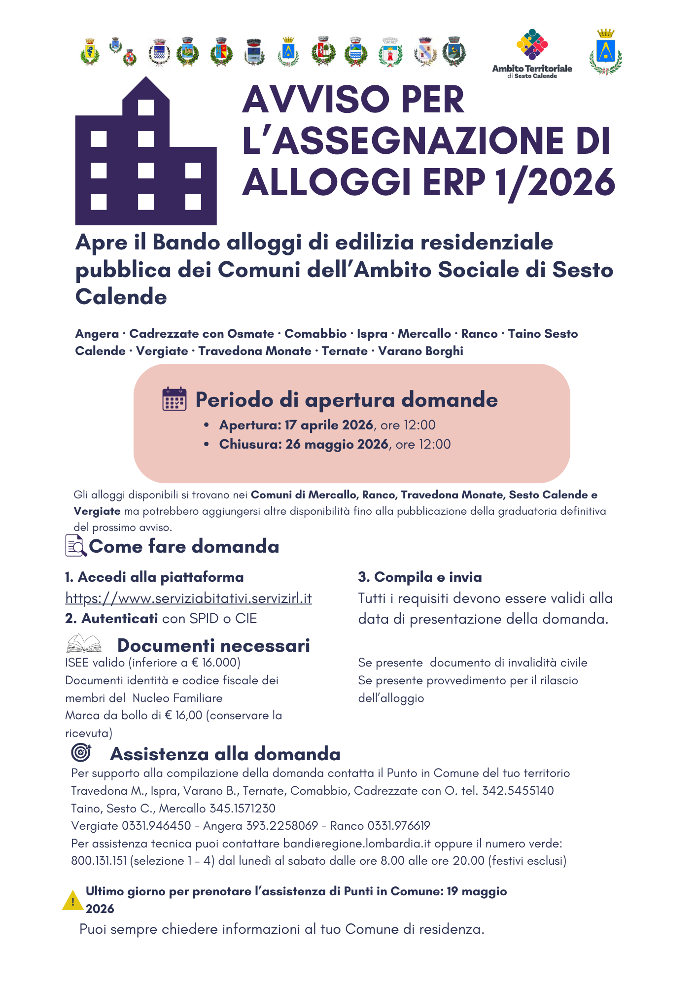 Dal 17 aprile al 26 maggio 2026 (ore 12.00) è aperto il Bando per gli Alloggi di Edilizia Residenziale Pubblica dei comuni dell’ambito sociale di Sesto Calende (Angera, Cadrezzate con Osmate, Comabbio, Ispra, Mercallo, Ranco, Taino, Sesto Calende, Vergiate, Travedona Monate, Ternate, Varano Borghi).